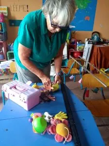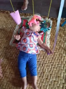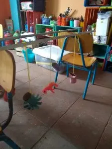 Trish, nuestra voluntaria de Cuerpo de Paz y profe de arte hizo unos móviles (como los de la cuna) con algunos objetos que encontramos en nuestro mueblecito de juguetes. Así que a unos palos largos se les amarraron distintas cosas coloridas y a diferente distancia.