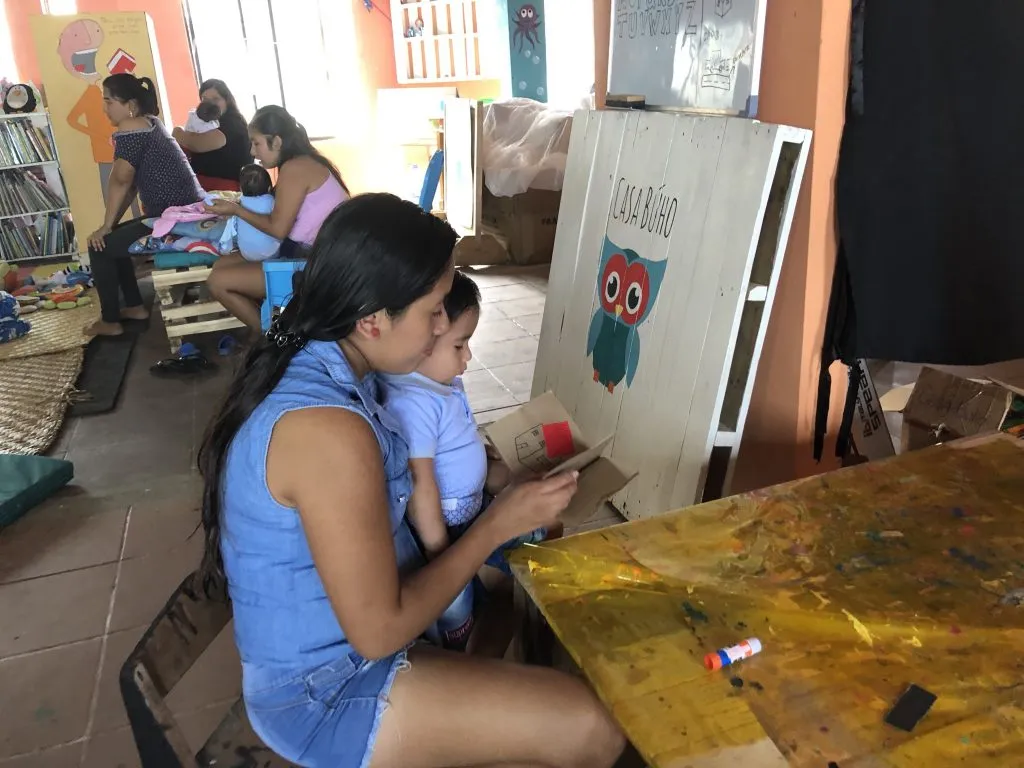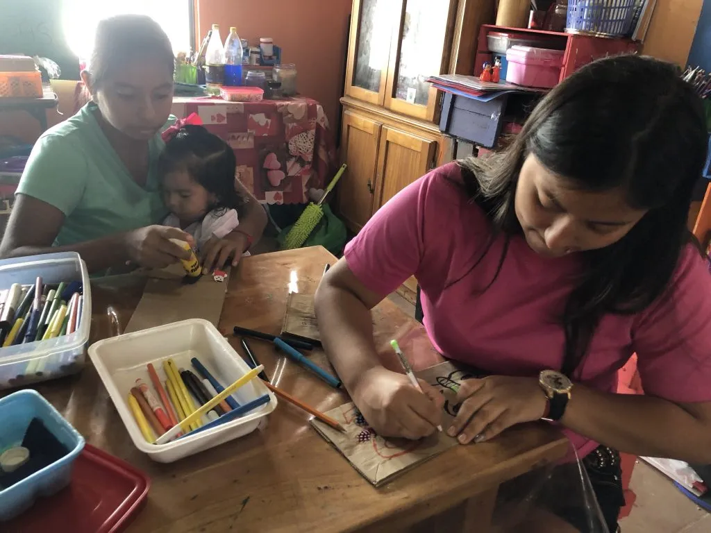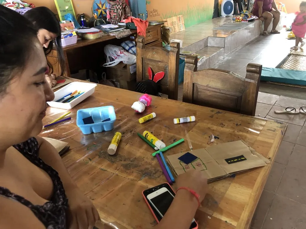 Our Tuesday morning Baby Búhos group continued work on their sensory books for “Septiembre Sensorial” adding in pages for a “rough” texture. We used sandpaper and corrugated cardboard to create a road and the roof of a house. The moms are increasingly excited about this project and next week they get to bring them home to practice texture and the senses with their babies!