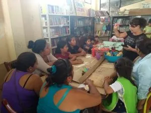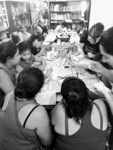 La tarde estaba súper calurosa, con la sala llena, abrimos todas las ventanas que pudimos para que entre una brisa que nos refresque. Aunque, hay que resaltar que, el calor no se interpuso con el entusiasmo de seguir pintando y creando. Chiquiturris y mamitas búho sentados alrededor de una mesa larga durante hora y media no solo aprendieron a realizar una nueva técnica de pintura sino que compartieron con otras mujeres, y a través del arte, nos contaron algunas mamitas que lograron canalizar emociones y pensamientos. La musiquita de fondo también ayudó mucho.
