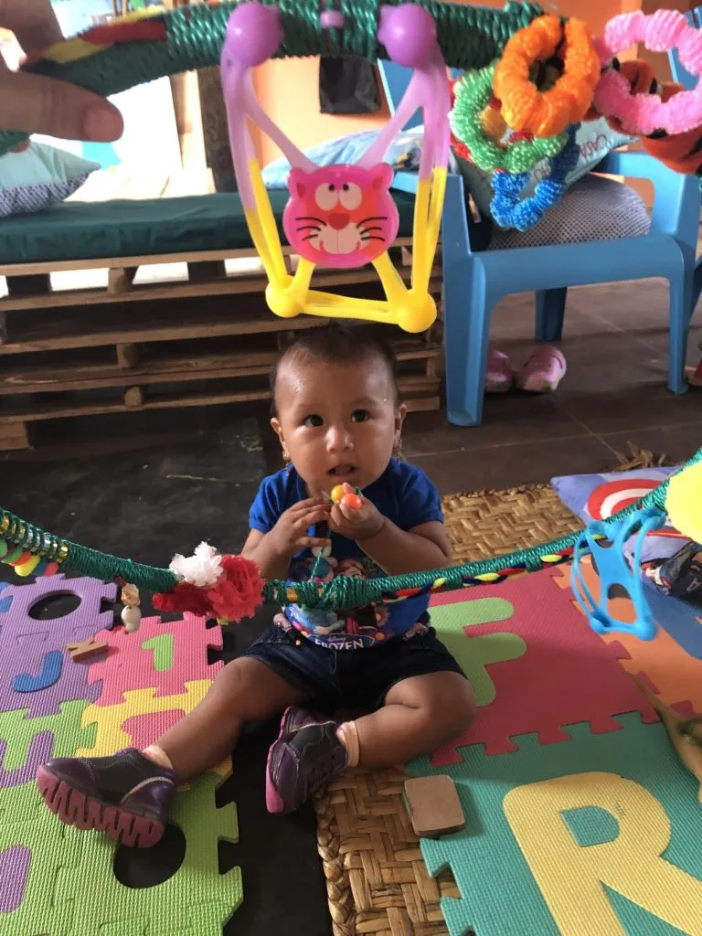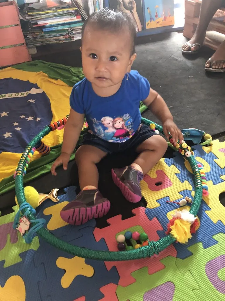 La sesión fue muy linda y como siempre tuvimos nuestros ejercicios en esta hora y media de trabajo. Con Kaeli, una bebita de 9 meses, usamos la hula-hula sensorial que fue hecha por nuestros voluntarios Sylvie y Magella que estuvieron el mes pasado haciendo voluntariado con nosotros. ¡Quedó muy linda!