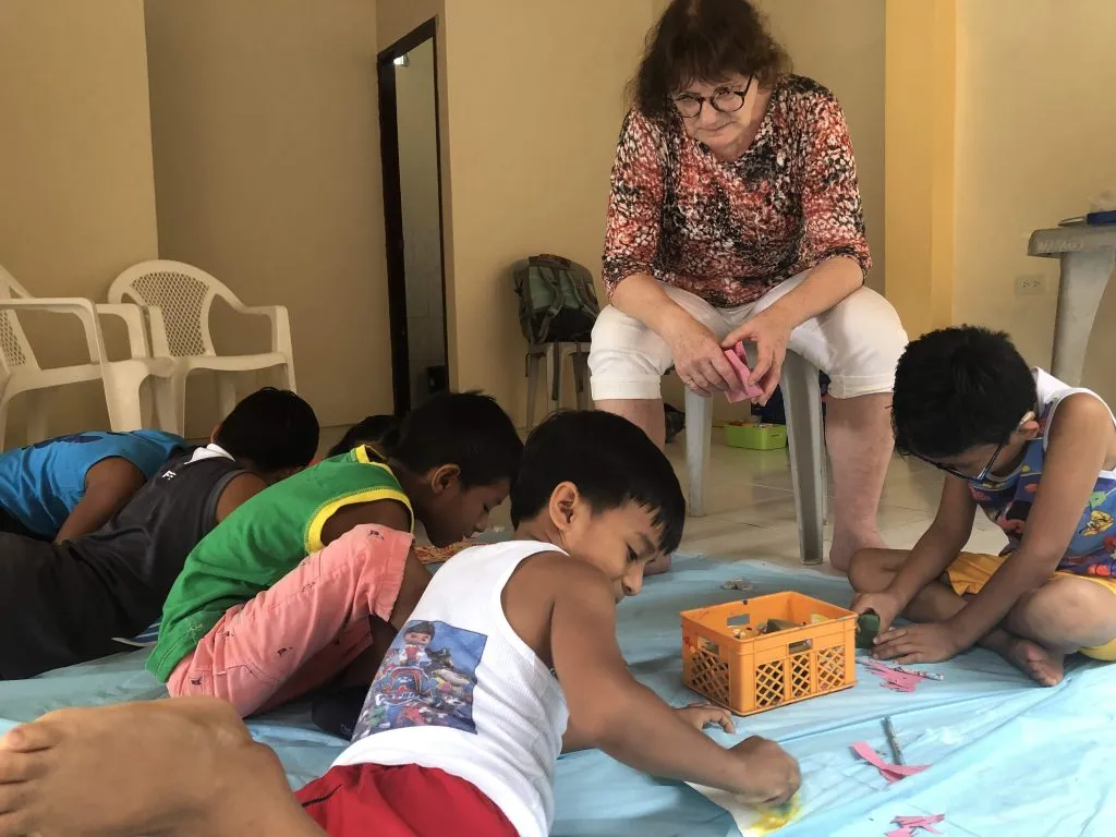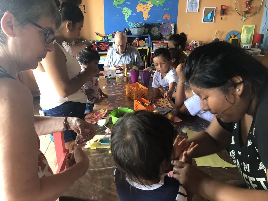 Aquí está Joustin junto a Helena, voluntaria de Solidarité Sud, quienes trabajan en un diorama.