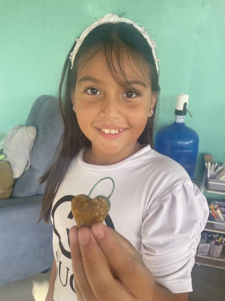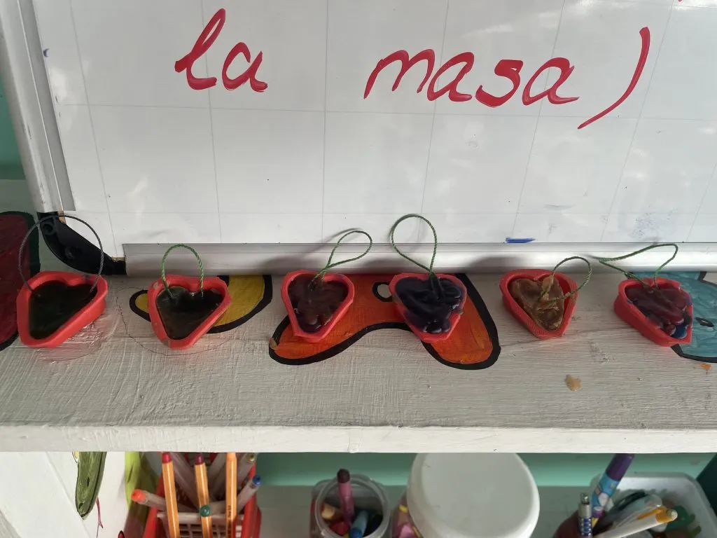 En las tardes con los grandes diseñamos colgantes de corazón con cera de vela.